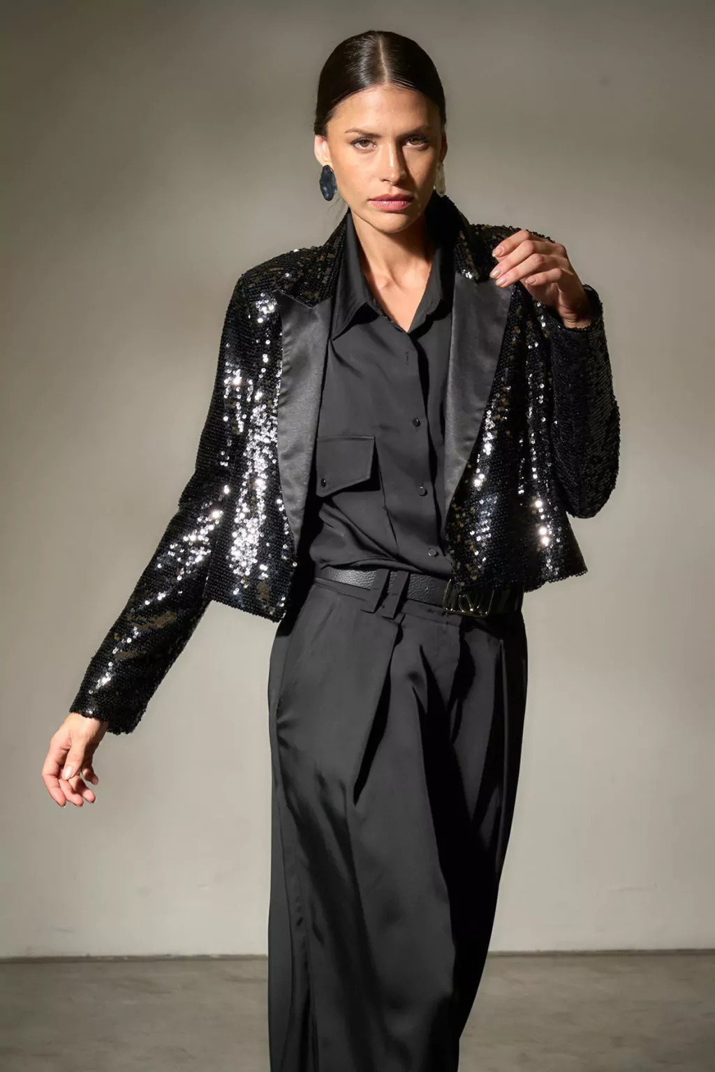 Saco confeccionado en pailette, forrado en satén. Posee solapa en frente delantero de satén, largo modular, bolsillos delanteros con tapa. Fusionado con entretela para dar el mejor calce.
