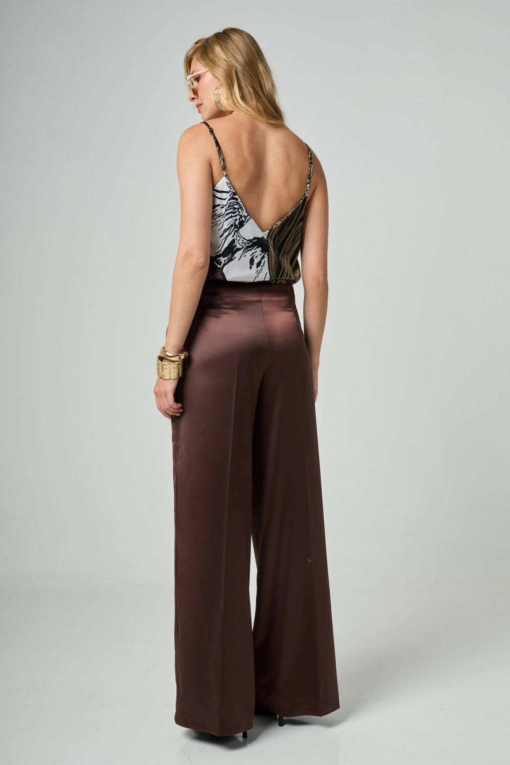 Pantalón confeccionado en satén, de tacto suave y caída fluida. De tiro medio, con silueta amplia que estiliza la figura y acompaña el movimiento del cuerpo.