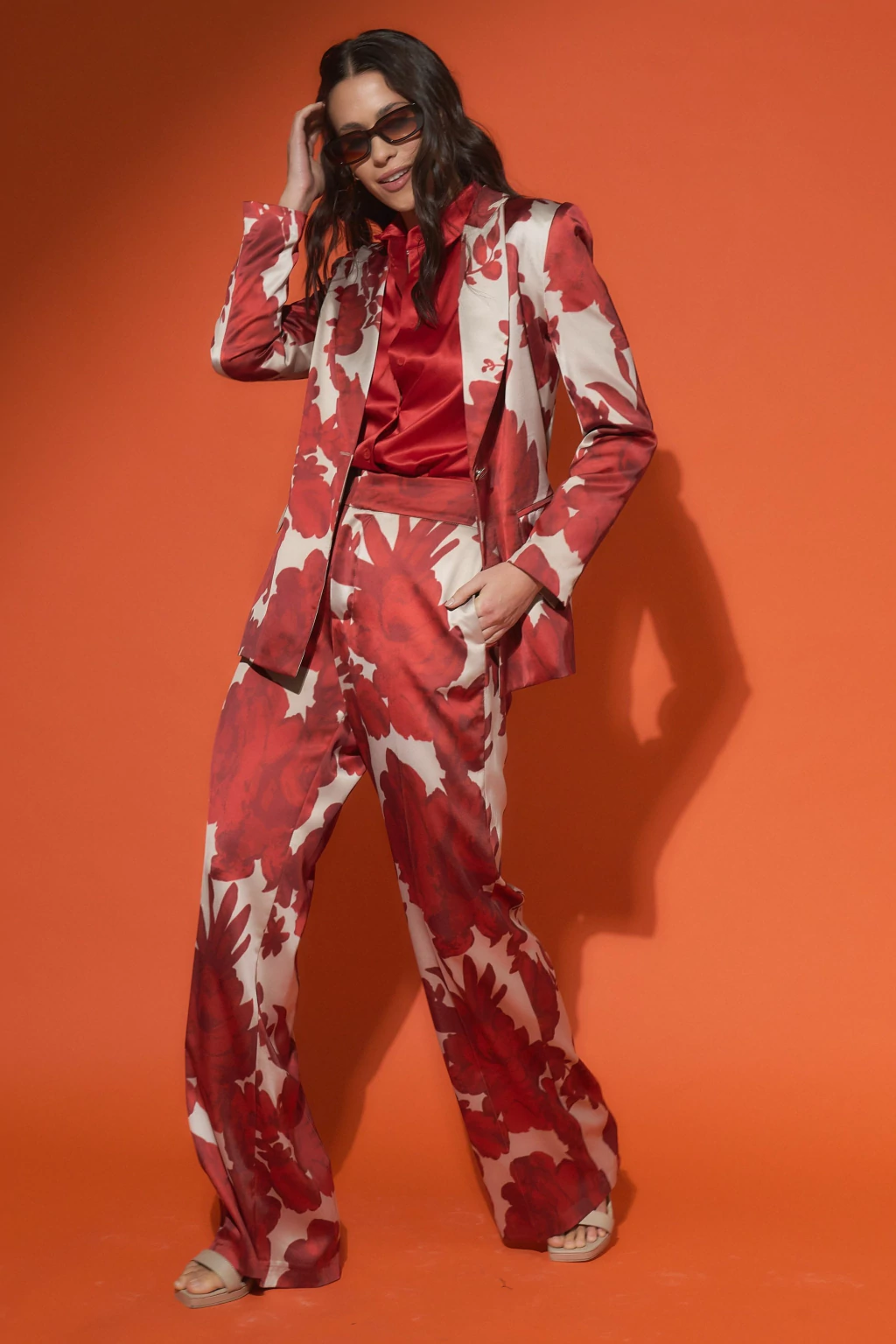 Blazer de satén, estampado con diseño exclusivo de JANIS para la colección SS26. Cuello solapa y manga larga con hombreras. Forrado en satén. Bolsillos ojal con tapa. Cierre frontal con botón metálico.