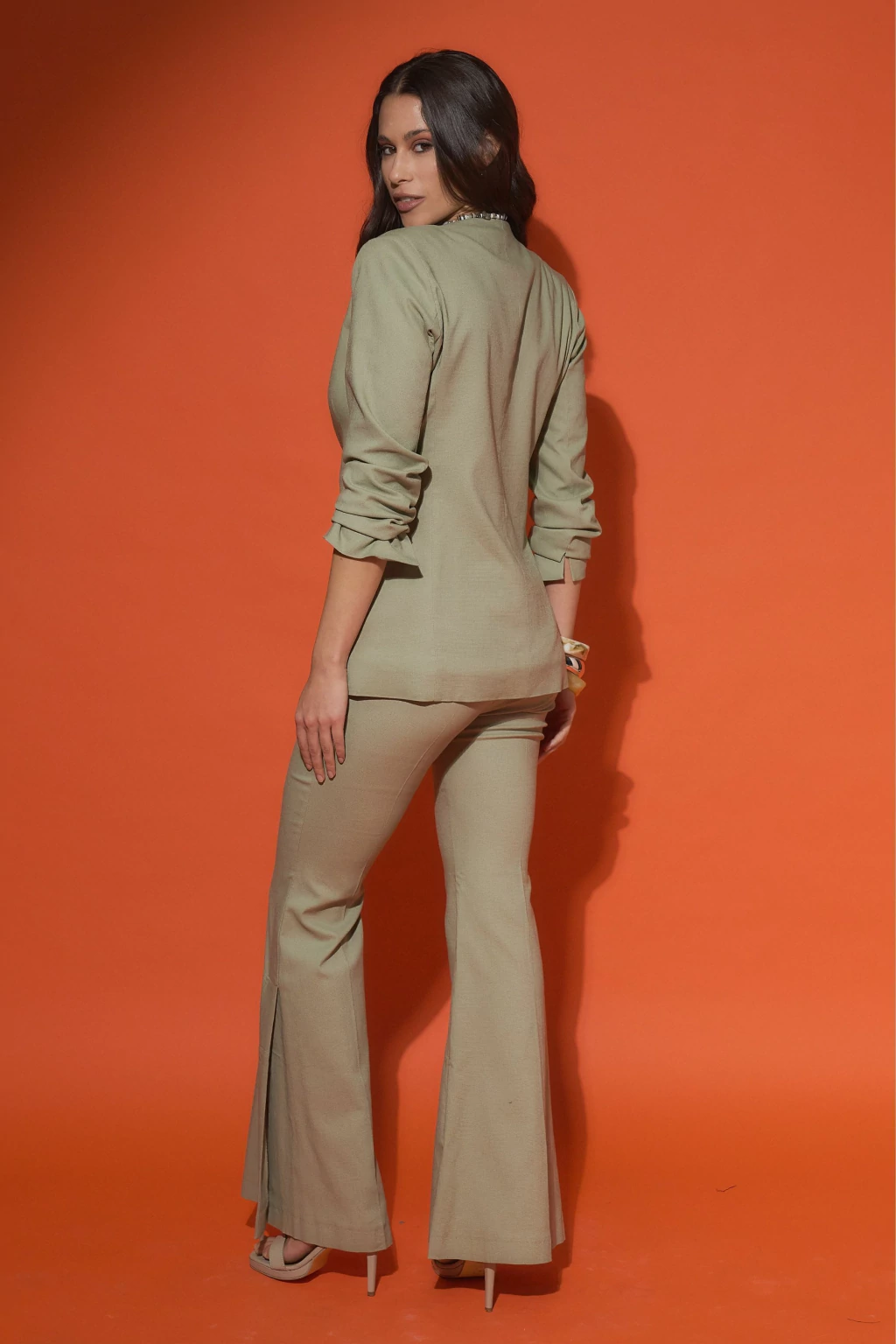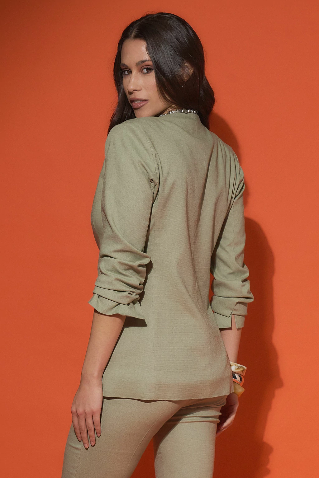 Blazer de lino con spándex. Cuello en V. Manga larga con hombreras. Forrado en satén. Bolsillos ojal con tapa. Cierre frontal con botón metálico, grabado con nuestro monograma.