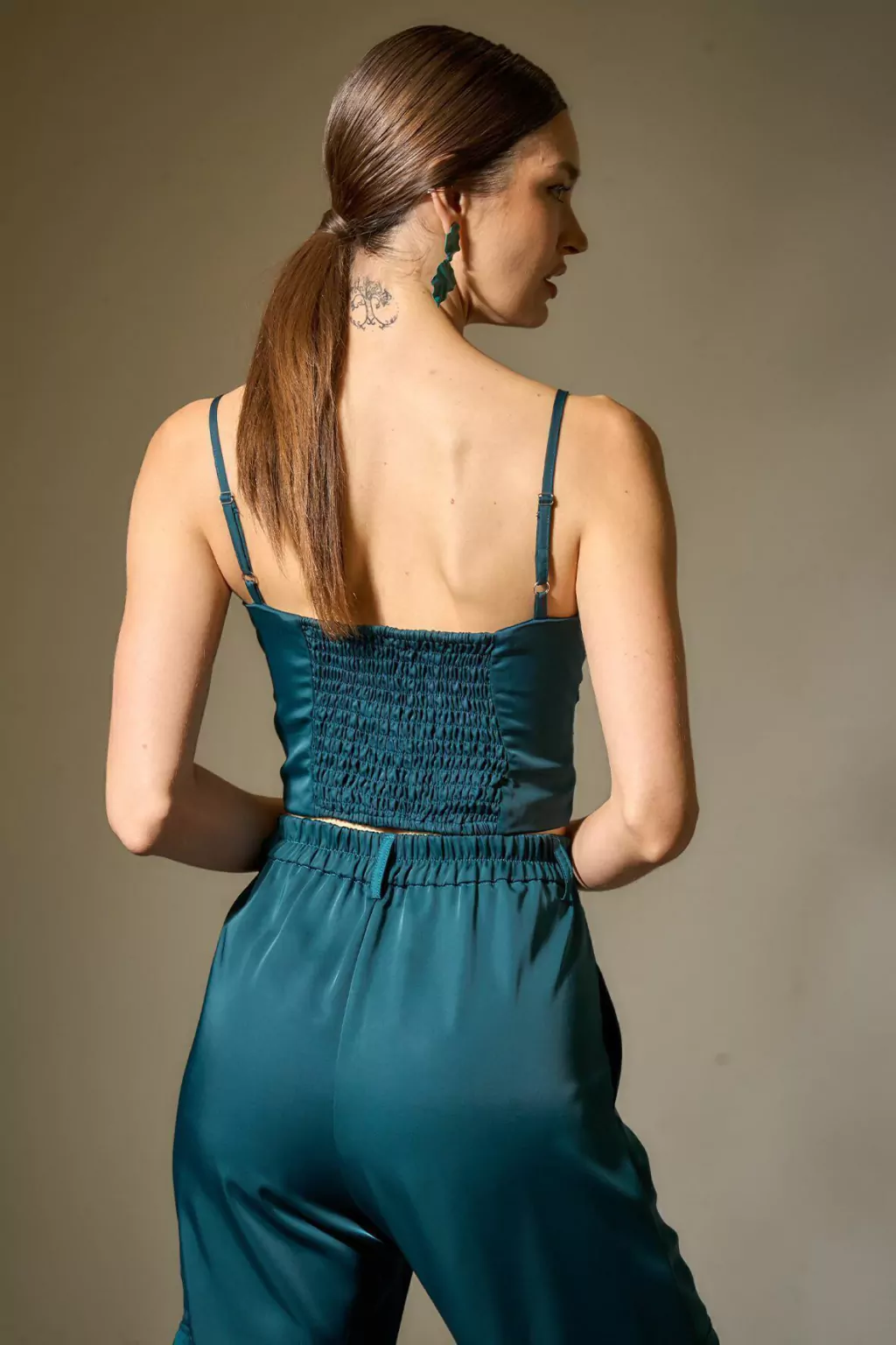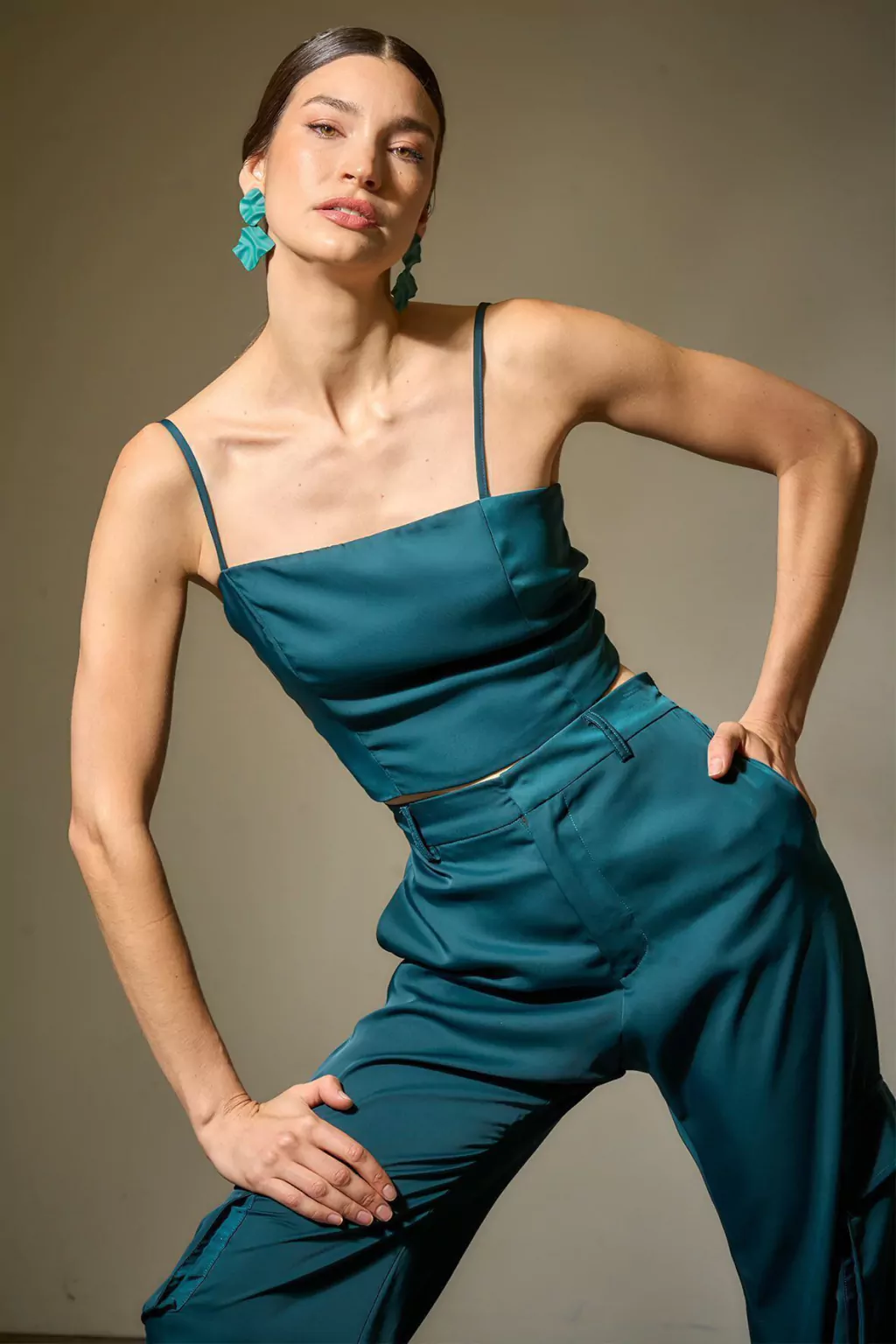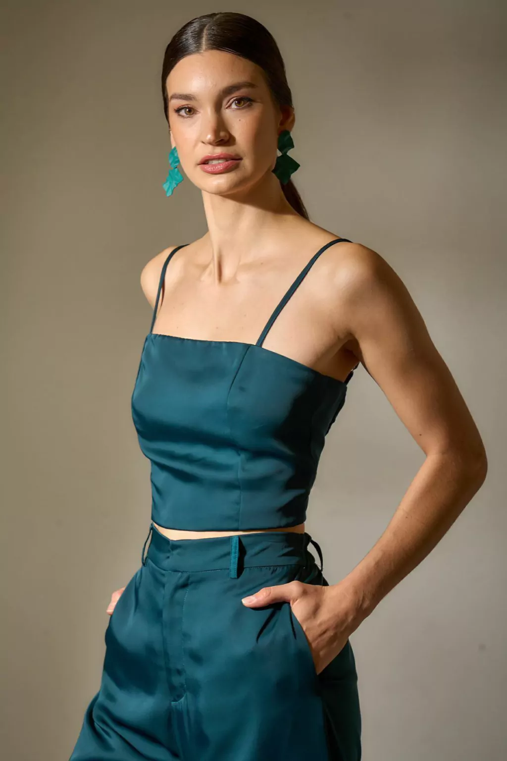 Top de escote recto y breteles finos ajustables confeccionado en satén.