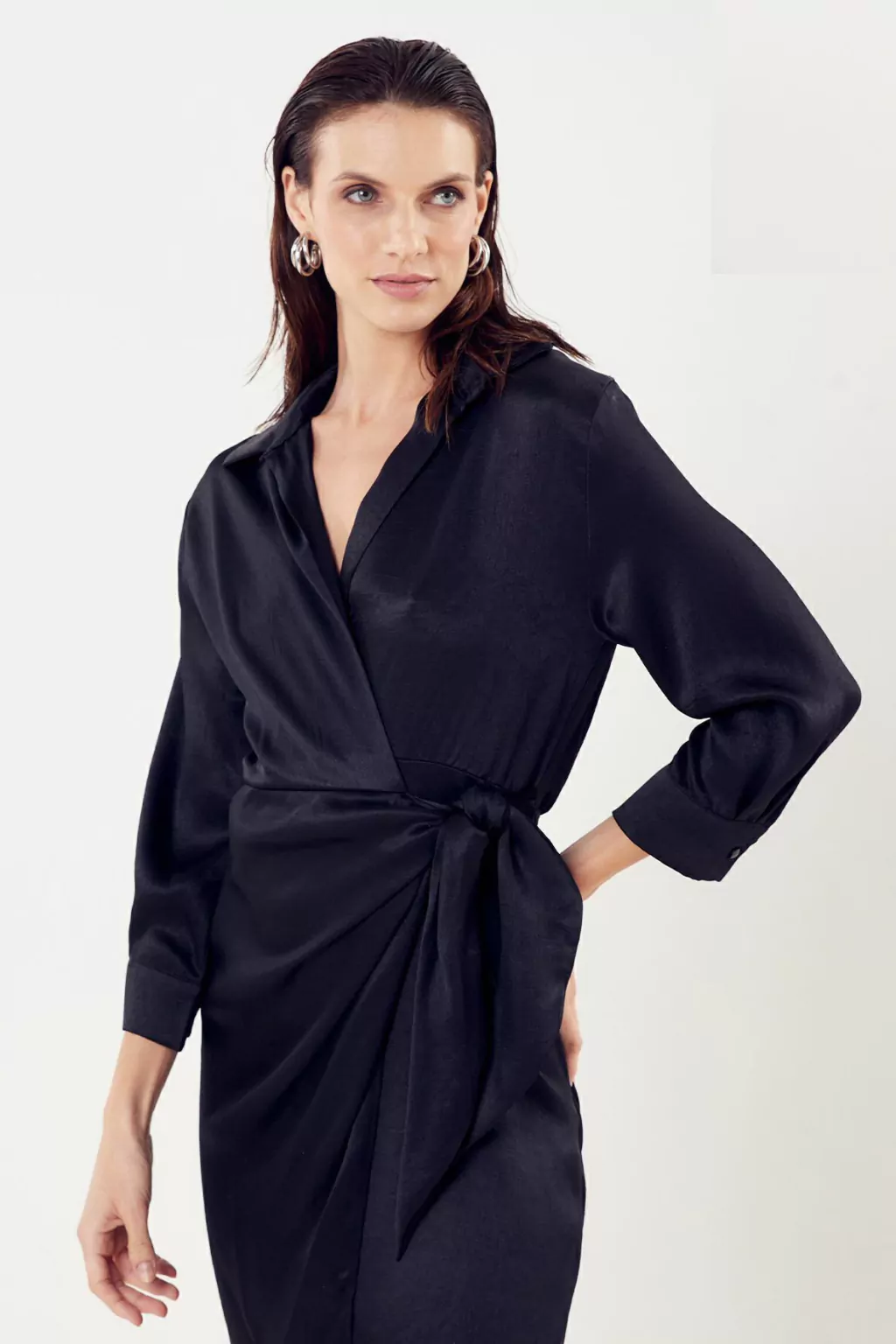Vestido folder confeccionado en seda laminada con acabado foil.
